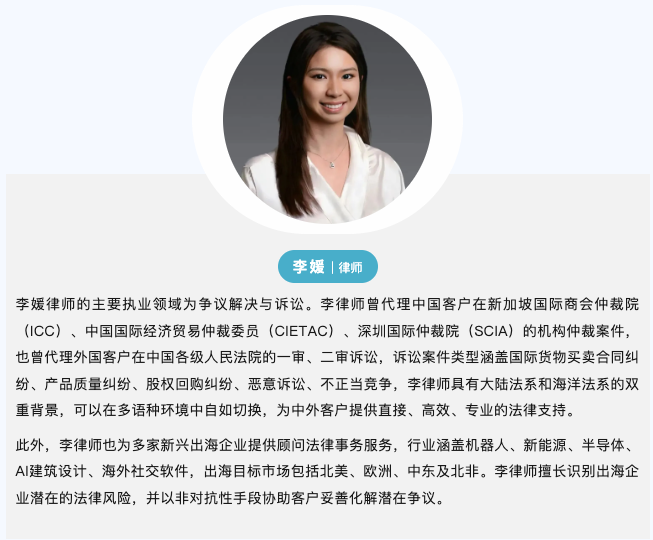 李媛律师精通中、英、日三国语言,具有十分出色的外语水平与跨文化协作能力,擅长处理各类国际法律事务。近年来,李律师参与处理了多起复杂的国际仲裁案件和跨境诉讼案件,能在充分理解企业商业逻辑的基础上,协助客户全面厘清关键事实,制定务实高效的应对策略,为纠纷的实质性化解提供了有力的法律支持。李律师本科毕业于南开大学,法律博士(J.D.)毕业于美国威斯康星大学麦迪逊分校,具备中国律师执业资格及美国纽约州执业资格。