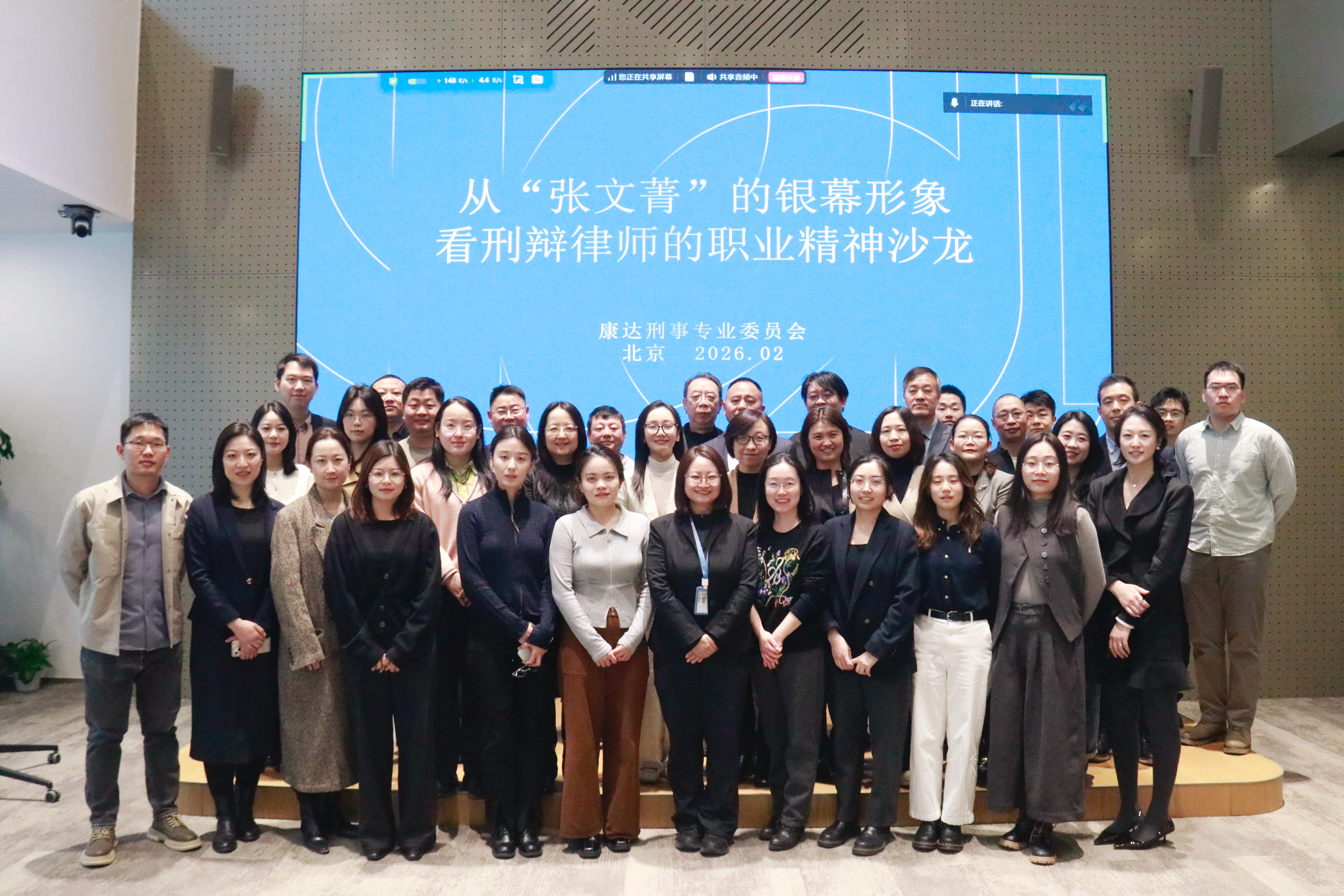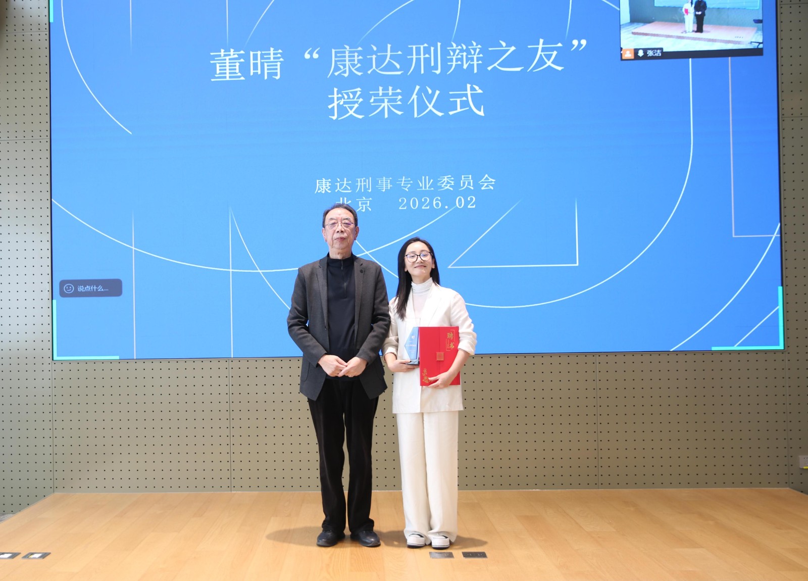 新春将至,岁寒情暖。2026年2月6日,康达刑事专业委员会(下称“刑委会”)邀请著名演员、央视热播扫黑反腐大剧《以法之名》中“张文菁律师”饰演者董晴女士来到康达总部观止讲堂,举行“康达刑辩之友”授荣仪式,并开展“从‘张文菁’的银幕形象看刑辩律师的职业精神”沙龙活动。康达管委会主任乔佳平,刑委会主任张保军,刑委会顾问梁丰年,刑委会副主任张麦昌、王可、冯振国以及刑委会委员,各业务部律师等百余人现场或通过线上参加该活动。活动由张保军律师主持。