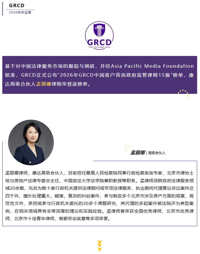 康达高级合伙人孟丽娜荣登“2026年GRCD中国客户首选政府监管律师15强”榜单