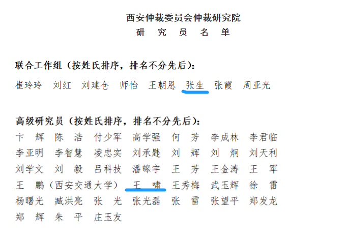 近日,西安仲裁委员会与西安交通大学法学院、西北政法大学国际法学院、西北大学法学院共建的西安仲裁委员会仲裁研究院的研究员遴选工作正式结束。经联合工作组三轮考核,最终确定了研究员名单,我所兼职律师张生获聘联合工作组成员;高级合伙人王啸律师获聘高级研究员;兼职律师李武健、合伙人李照东律师、合伙人慕丽律师获聘研究员;合伙人肖鸿炜获聘青年研究员。