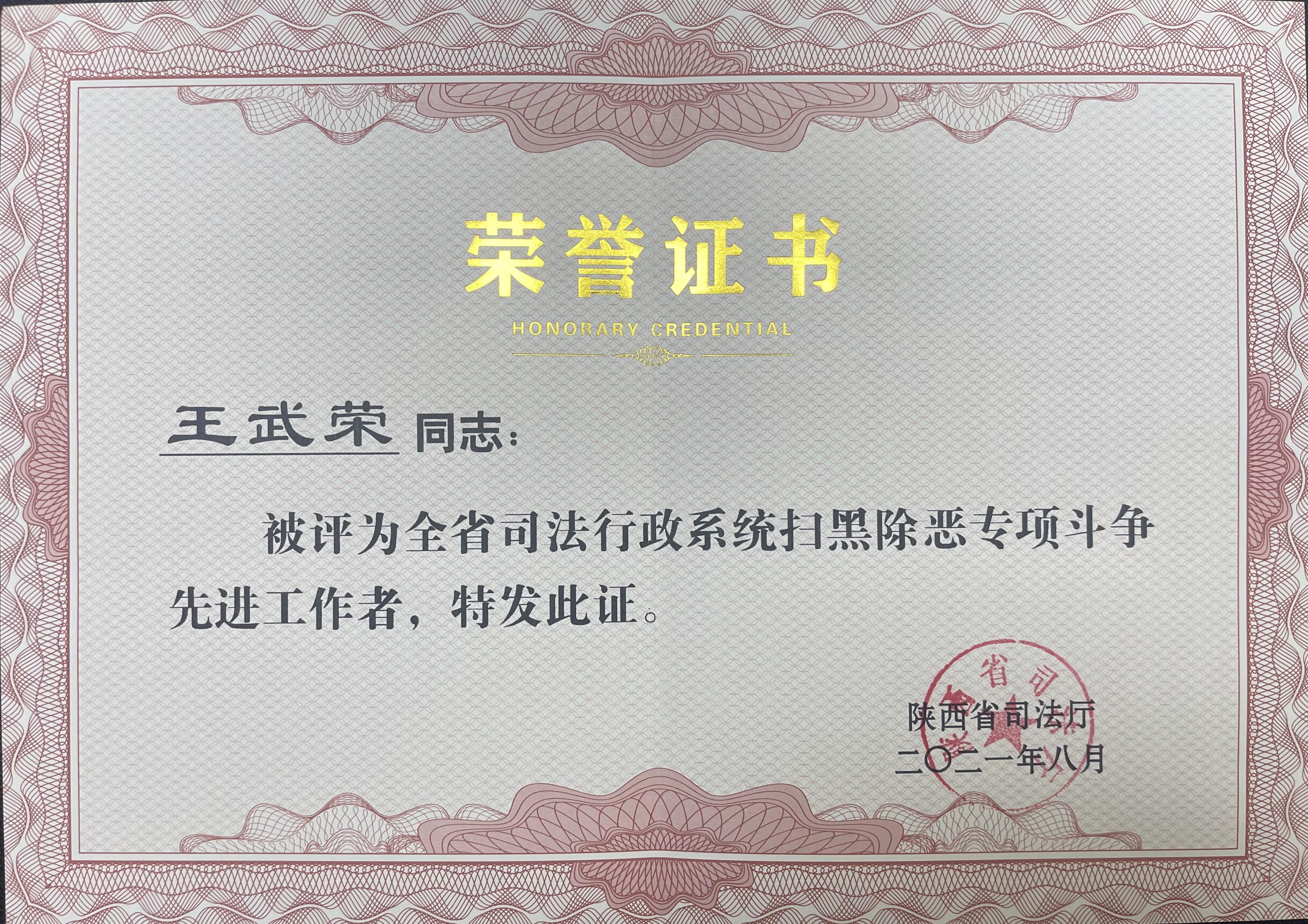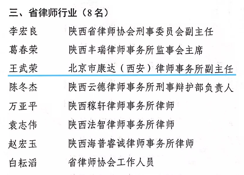 2021年8月13日,陕西省司法厅发布了关于表彰扫黑除恶专项斗争先进集体和先进工作者的通报,康达西安律师事务所高级合伙人、副主任王武荣被评为全省司法行政系统扫黑除恶专项斗争先进工作者。