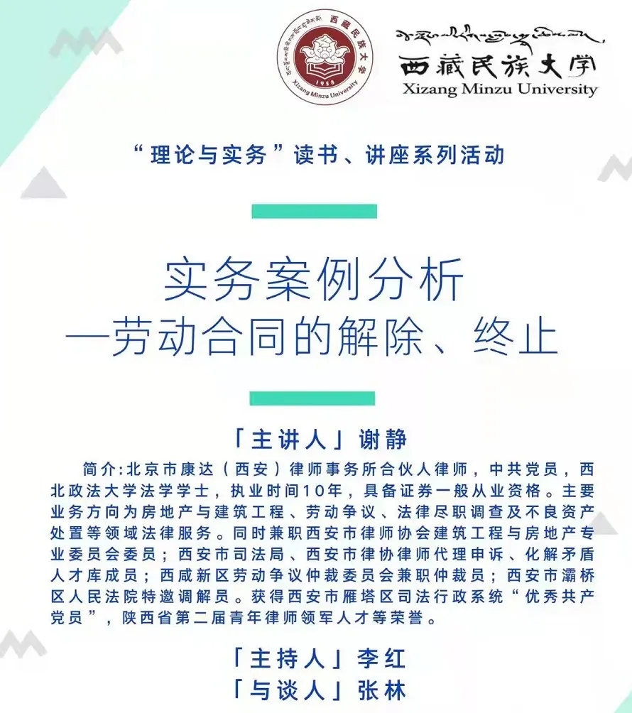 2021年12月3日,康达(西安)律师事务所合伙人谢静律师应邀为西藏民族大学作劳动合同的解除与终止实务专题讲座。本次讲座以线上方式进行,由西藏民族大学法学院李红老师主持,法学院张林院长作为与谈人参加。