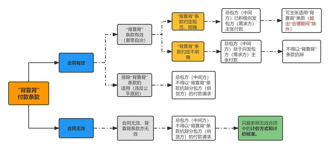 1、尽可能避免约定“背靠背”条款。若基于总包方(中间方)的强势地位必须接受“背靠背”条款,可以尝试从“背靠背”条款约定不明、总包方(中间方)存在违约、总包方(中间方)怠于主张权利、合同无效等角度,争取排除“背靠背”条款的适用,以维护自身的合法权益。