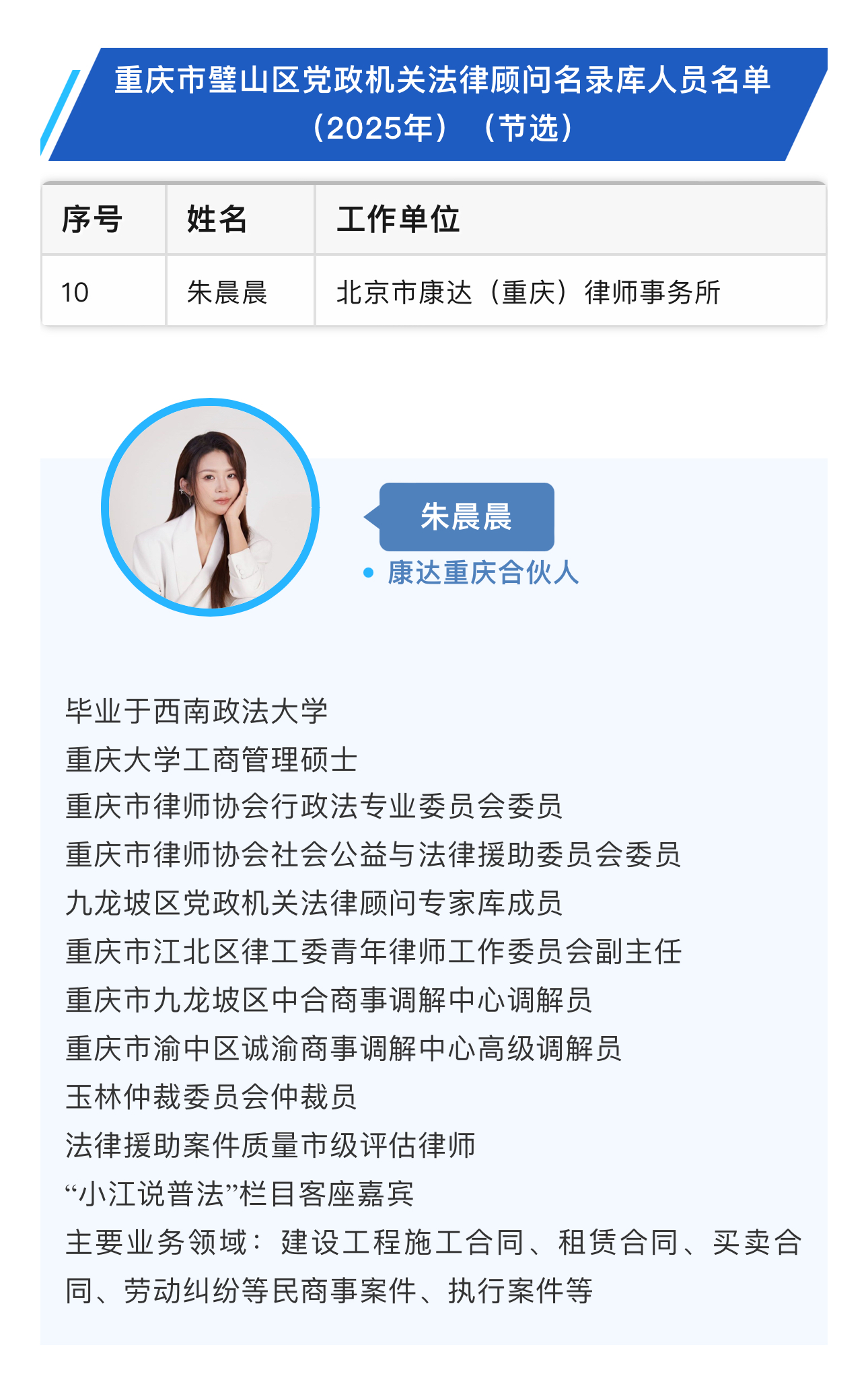 近日,重庆市璧山区司法局对2025年党政机关法律顾问名录库人员名单进行了公示,康达重庆合伙人朱晨晨律师成功入选。