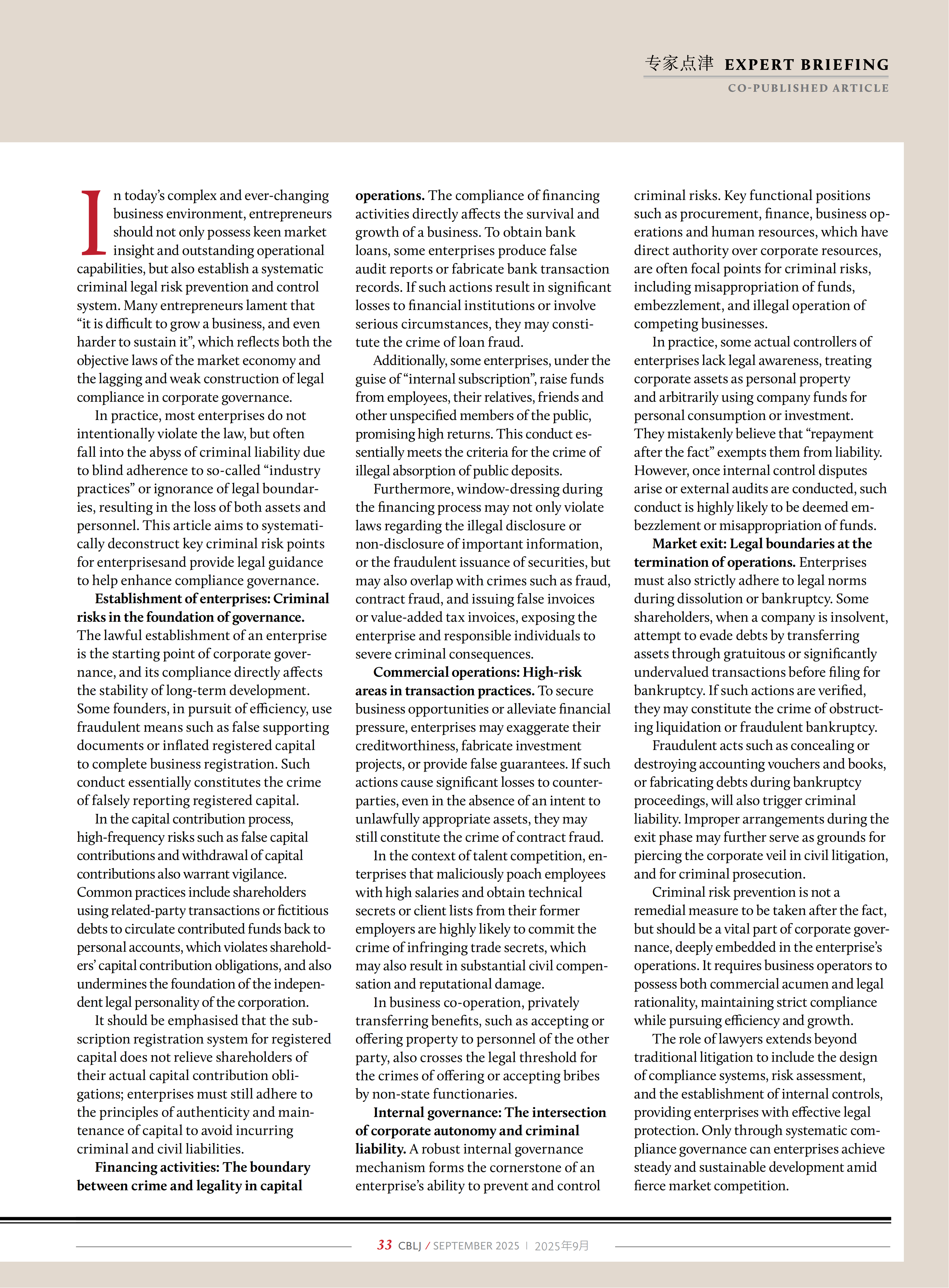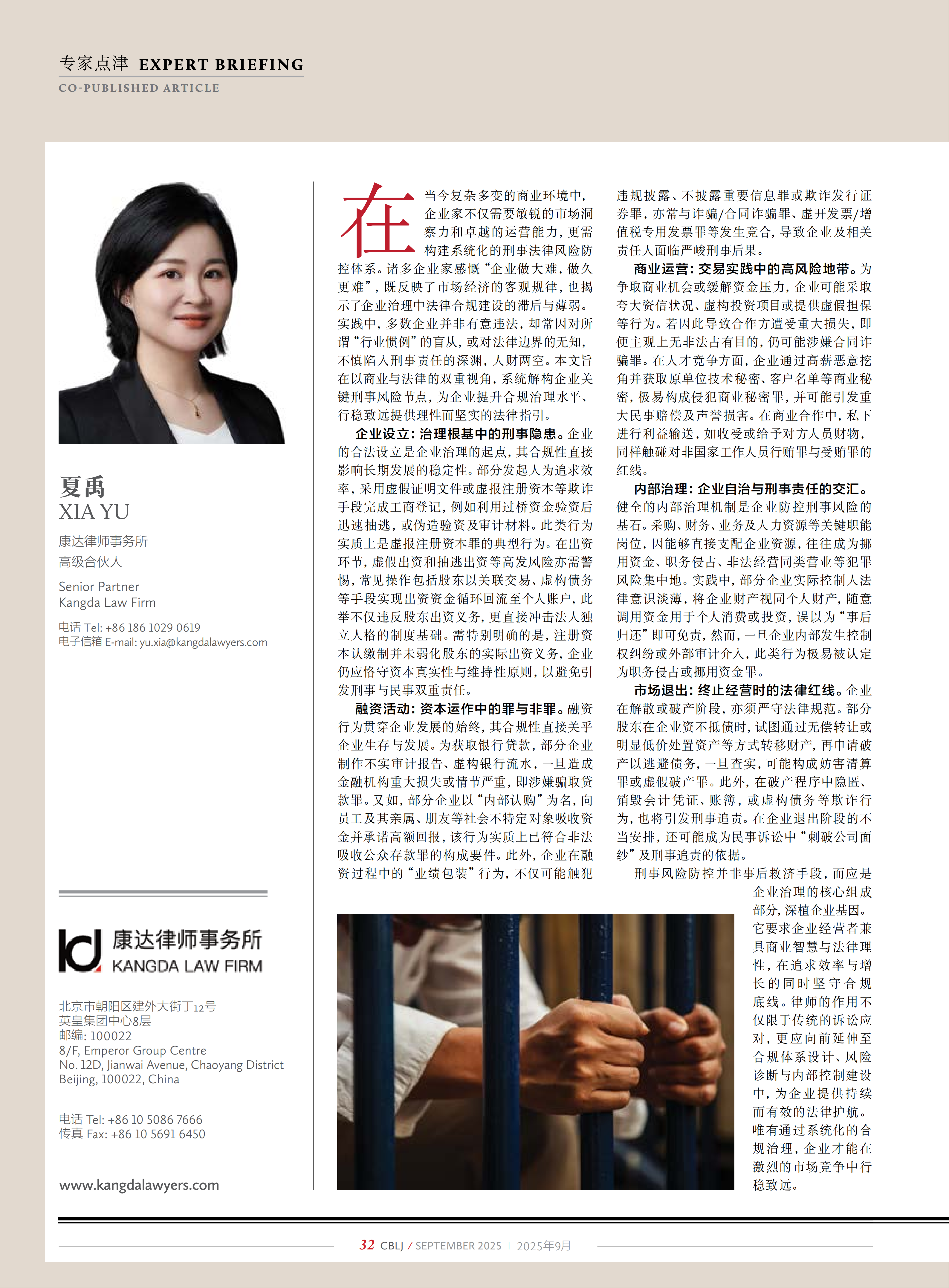 近日,受知名双语法律杂志《商法》(China Business Law Journal)邀请,康达高级合伙人夏禹律师在2025年9月刊的“专家点津”栏目中,发表题为《企业刑事风险防控指南》文章。