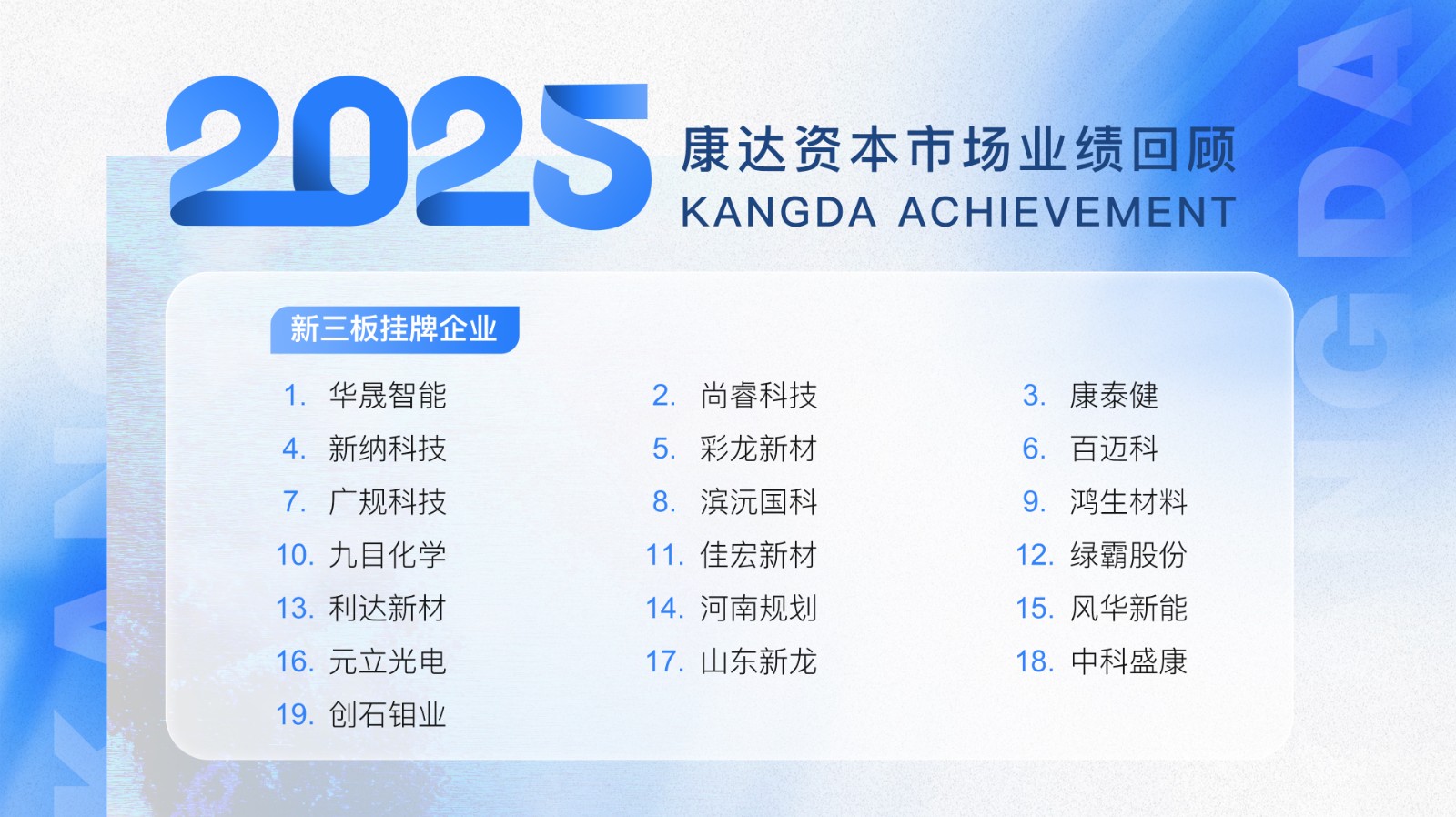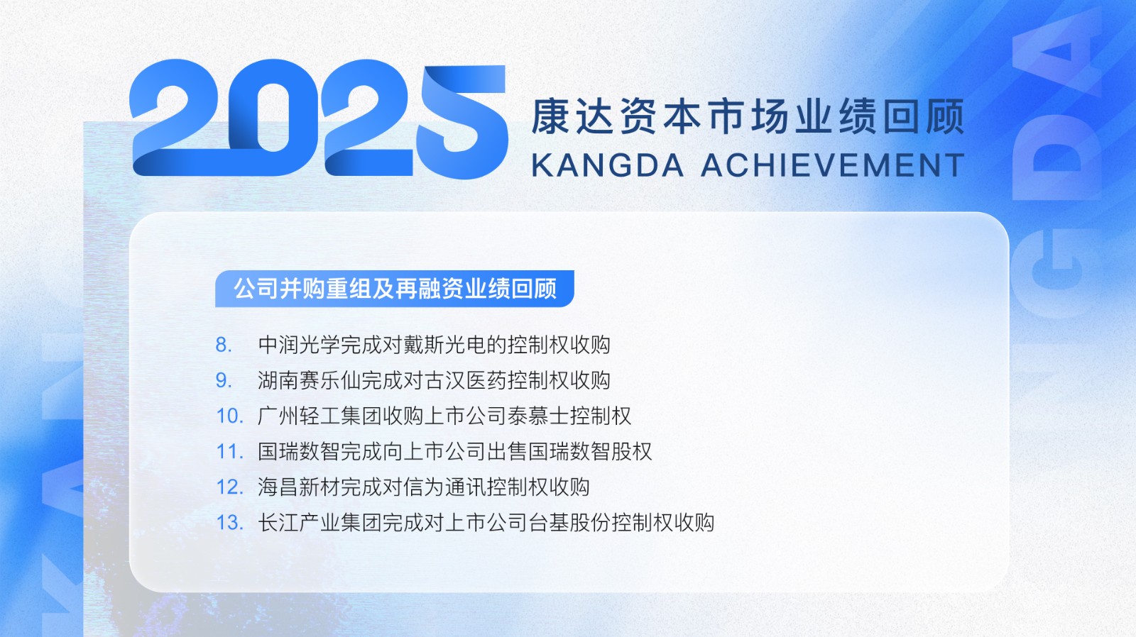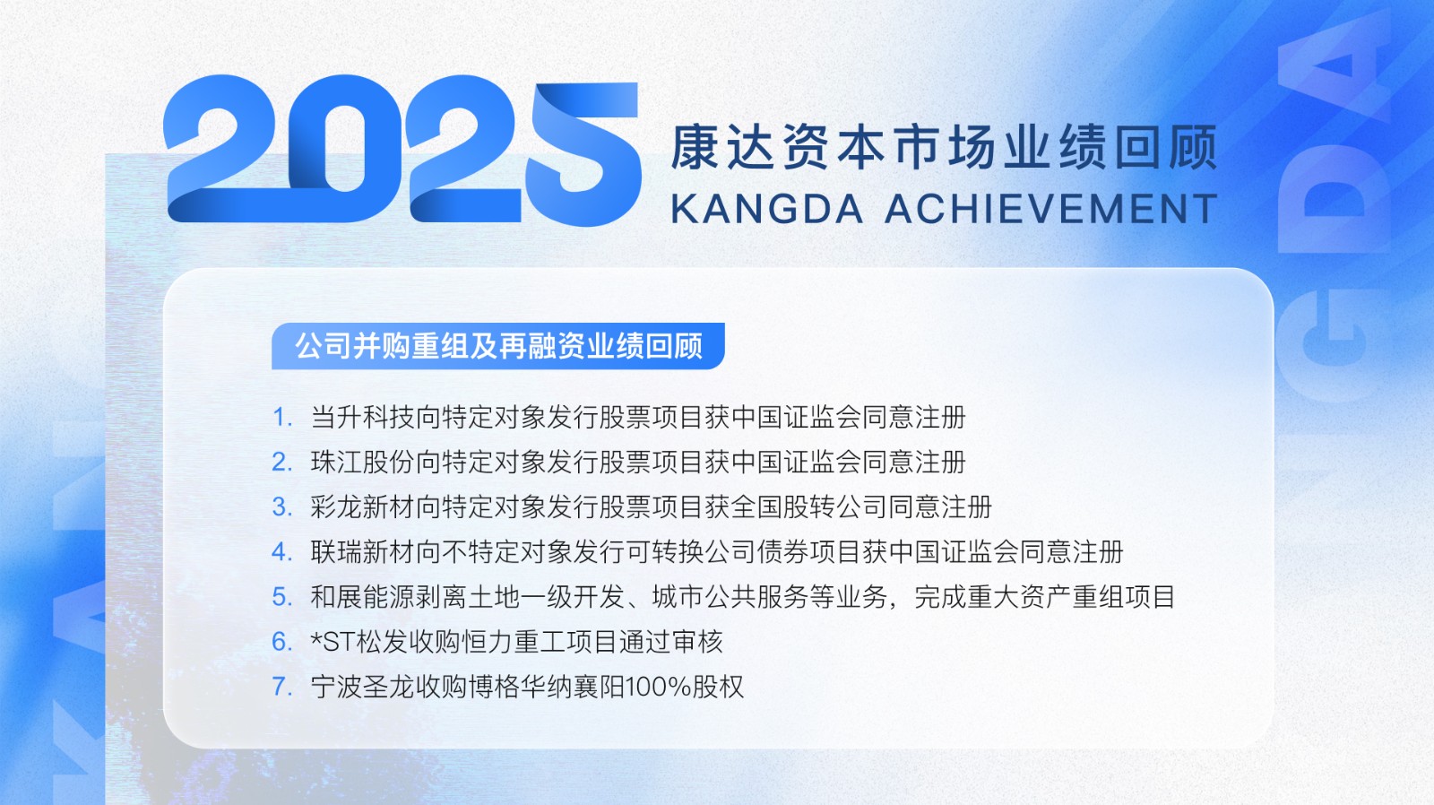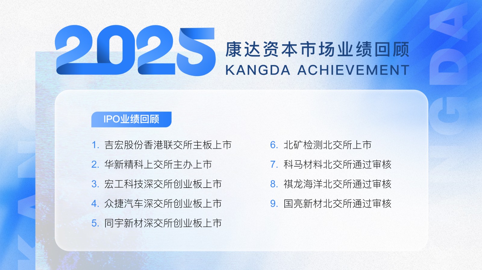 2025年,康达继续以扎实的专业功底、敏锐的市场洞察和高效的执行能力,为客户提供全方位的资本市场法律解决方案。未来,康达将继续坚守执业品质,以持续迭代的专业服务陪伴企业成长,助力更多企业借助资本市场实现战略升级与高质量发展。