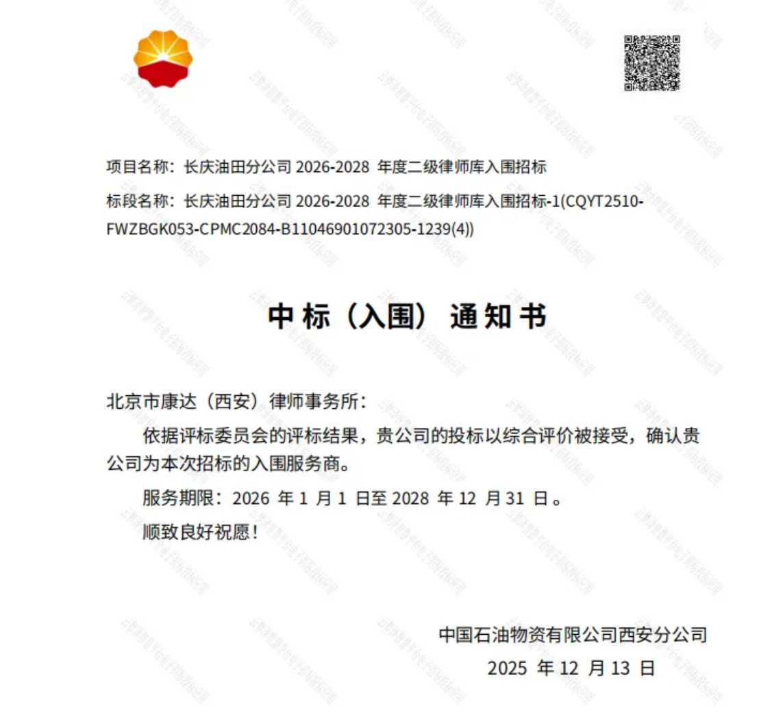2025年12月13日,经严格评审与综合遴选,康达(西安)律师事务所凭借在能源领域、公司商事、争议解决等法律服务方面的专业实力与丰富的实践经验,成功入围中国石油天然气股份有限公司长庆油田分公司二级律师库。