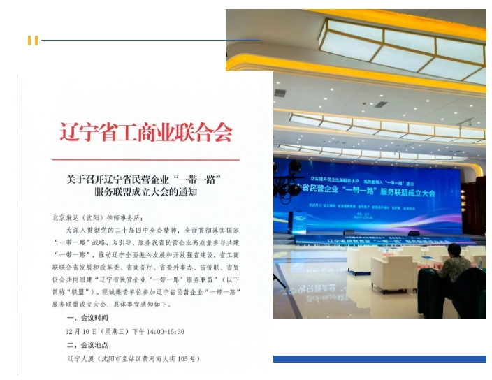 12月10日,辽宁省民营企业“一带一路”服务联盟成立大会隆重召开。北京市康达(沈阳)律师事务所姜春颖律师受邀出席本次盛会,与有关部门领导、民营企业精英及法律界同仁齐聚一堂,共话辽宁民企“走出去”的法治保障新路径,助力共建“一带一路”高质量发展。